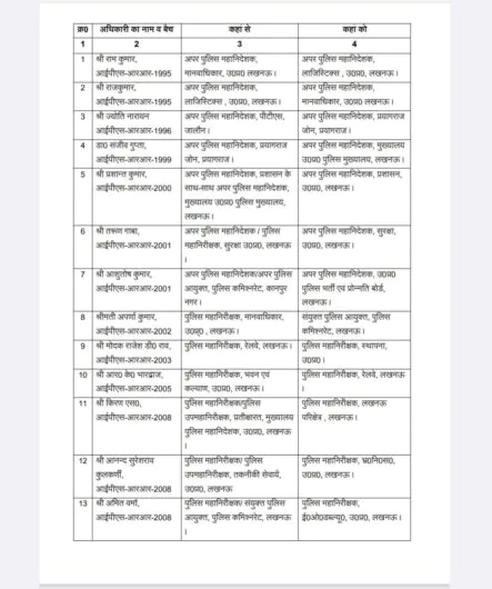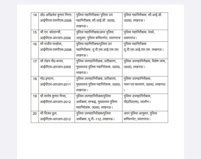 लखनऊ- यूपी में बुधवार को पुलिस विभाग में बड़ा फ़ेरबदल किया गया है। उत्तर प्रदेश शासन ने बुधवार को सरकार ने केंद्रीय प्रतिनियुक्ति से लौटे अधिकारियों को महत्वपूर्ण तैनाती दी है, तो वहीं कुछ अनुभवी चेहरों को नई कमान भी सौंपी है। यूपी में 20 आईपीएस अधिकारियों के तबादले किये गए। प्रशांत कुमार को अपर पुलिस महानिदेशक प्रशासन लखनऊ बनाया गया। देखें पूरी लिस्ट किसको कहाँ मिली तैनाती…