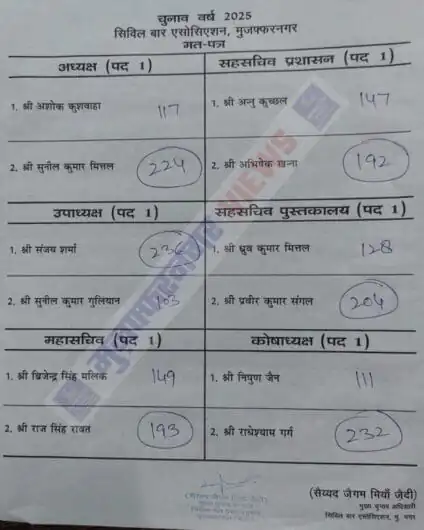 मुजफ्फरनगर- सिविल बार एसोसिएशन की नई कार्यकारिणी वर्ष 2025 के लिए 20 दिसम्बर 2024 को हुए चुनावों की मतगणना आज सवेरे 8 बजे से शुरू हुई। मतगणना शाम तक सम्पन्न हुई जिसमें अध्यक्ष पद पर सुनील कुमार मित्तल तो महासचिव पद पर राज सिंह रावत विजयी हुए। सभी विजयी प्रत्यशियों का फूल मालाओं से किया गया स्वागत।