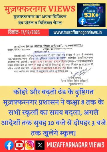 जिला विद्यालय निरीक्षक द्वारा आज 18 दिसम्बर 2025 को निर्देश जारी किए गए हैं जिसमें अत्यधिक ठंड और कोहरे के दृष्टिगत जनपद के समस्त माध्यमिक विद्यालयों (कक्षा-06 से 12 तक) का समय दिनांक 18.12.2025 से अग्रिम आदेशों तक प्रातः 10.00 बजे से अपराह्न 03.00 बजे तक किया गया है।