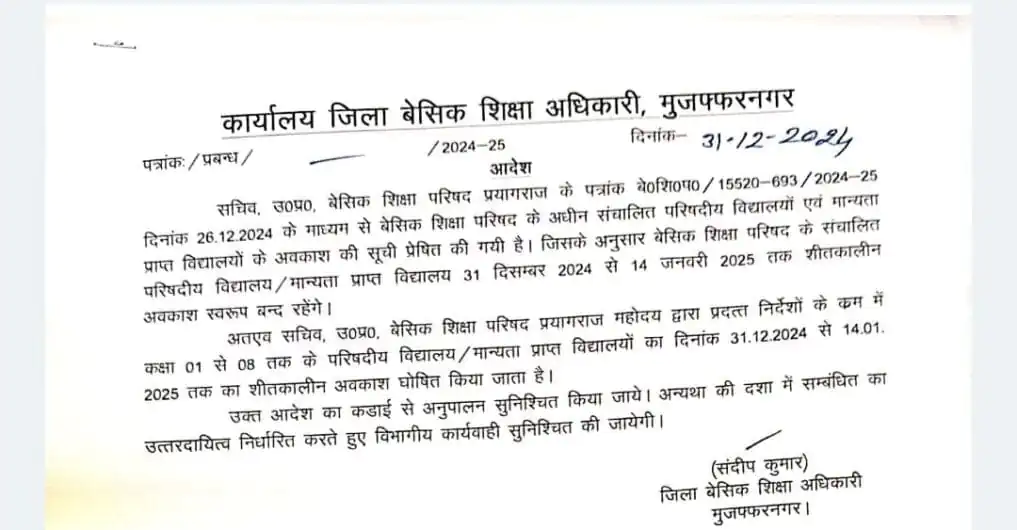 मुजफ्फरनगर- बढ़ती ठंड से उत्पन्न शीतलहर जहाँ मौसम को सर्द बना रही है तो वहीं बच्चों को सर्दी से राहत के लिए जनपद प्रशासन ने लंबी छुट्टियों की घोषणा कर दी है। जिला बेसिक शिक्षा अधिकारी के ताजा आदेश के अनुसार 31 दिसम्बर से आगामी 14 जनवरी तक कक्षा 1 से कक्षा 8 तक के समस्त स्कूलों में शीतकालीन अवकाश की घोषणा कर दी गयी है।
