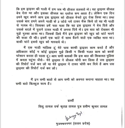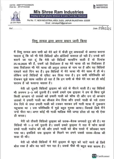 अब आज 29 मई की रात्रि में विशु तायल 2 पेज का सफ़ाईनामा मीडिया को भेजा है जिसमें ड्राइवरों की गलतियों का बखान करते हुए उन्होंने उनके द्वारा उनको सजा देने की बात कबूली है।