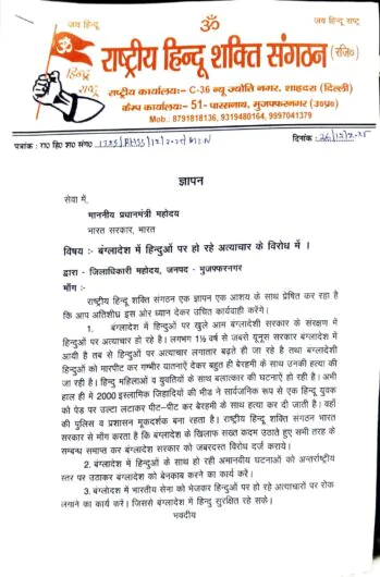 मुज़फ्फरनगर- बांग्लादेश में अल्पसंख्यक हिन्दू समुदाय के लोगों पर हो रहे अत्याचारों का मामला गरमाया हुआ है, मुज़फ्फरनगर ही नहीं सम्पूर्ण भारत में बांग्लादेश के विरुद्ध एक्शन की आवाज उठने लगी है। राष्ट्रीय हिन्दू शक्ति संगठन द्वारा भी बांग्लादेश में हो रहे हिंदुओं पर अत्याचार के विरोध में जिलाधिकारी को ज्ञापन सौंपा गया।