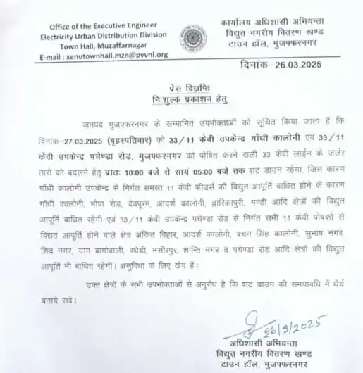 बिजली सूचना– दिनांक-27.03.2025 (बृहस्पतिवार) को 33/11 केवी उपकेन्द्र गाँधी कालोनी एवं 33/11 केवी उपकेन्द्र पचेण्डा रोड़, मुजफ्फरनगर को पोषित करने वाली 33 केवी लाईन के जर्जर तारो को बदलने हेतु प्रातः 10:00 बजे से सायं 05:00 बजे तक शट डाउन रहेगा, जिस कारण गाँधी कालोनी उपकेन्द्र से निर्गत समस्त 11 केवी फीडर्स की विद्युत आपूर्ति बाधित होने के कारण गाँधी कालोनी, भोपा रोड़, देवपूरम, आदर्श कालोनी, द्वारिकापुरी, मण्डी आदि क्षेत्रों की विद्युत आपूर्ति बाधित रहेगी एवं 33/11 केवी उपकेन्द्र पचेण्डा रोड़ से निर्गत सभी 11 केवी पोषको से विद्यत आपूर्ति होने वाले क्षेत्र अंकित विहार, आदर्श कालोनी, बचन सिंह कालोनी, सुभाष नगर, शिव नगर, ग्राम बागोवाली, रथेडी, नसीरपुर, शान्ति नगर व पचेण्डा रोड आदि क्षेत्रों की विद्युत आपूर्ति भी बाधित रहेगी।