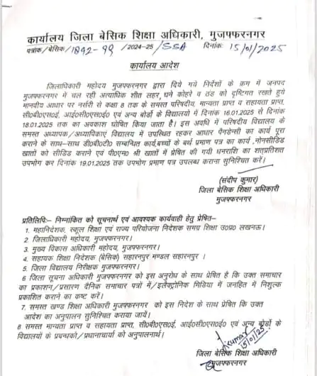 जिलाधिकारी द्वारा दिये गये निर्देशों के क्रम में जनपद मुजफ्फरनगर में चल रही अत्याधिक शीत लहर, घने कोहरे व ठंड को दृष्टिगत रखते हुये मानवीय आधार पर नर्सरी से कक्षा 8 तक के समस्त परिषदीय, मान्यता प्राप्त व सहायता प्राप्त, सी०बी०एस०ई, आई०सी०एस०ई० एवं अन्य बोर्डो के विद्यालयो में दिनांक 16.01.2025 से दिनांक 18.01.2025 तक का अवकाश घोषित किया जाता है। इस अवधि में परिषदीय विद्यालय के समस्त अध्यापक/अध्यापिकाएं विद्यालय में उपस्थित रहकर आधार पैनडेन्सी का कार्य पूरा कराने के साथ-साथ डी०बी०टी० सम्बन्धित कार्य, बच्चों के बर्थ प्रमाण पत्र का कार्य, नोनसीडिड खातों को सीडिड कराने एवं पी०एम० श्री खातों में प्रेषित की गयी धनराशि का शत्प्रतिशत उपभोग कर दिनांक 19.01.2025 तक उपभोग प्रमाण पत्र उपलब्ध कराना सुनिश्चित करें।