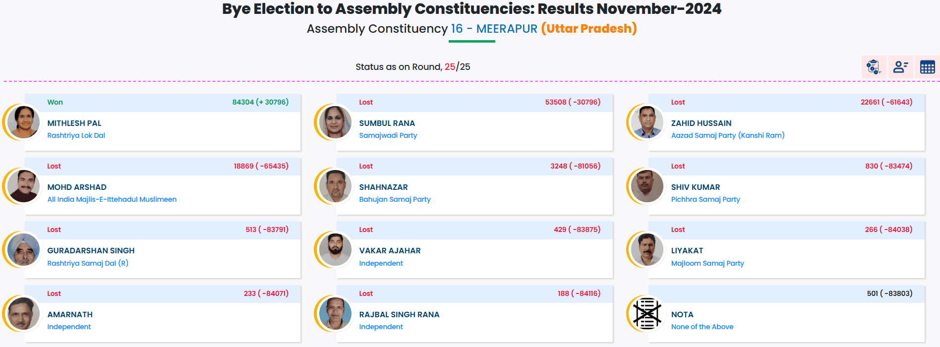मुजफ्फरनगर- यूपी की 9 विधानसभा सीटों पर हुए उपचुनाव में मुजफ्फरनगर की मीरापुर सीट ख़ूब चर्चाओं में रही। यहाँ मुख्य मुक़ाबले में सपा गठबंधन और भाजपा-रालोद गठबंधन के प्रत्याशियों में ही टक्कर मानी जा रही थी। तो वहीं आज़ाद समाज पार्टी के प्रत्याशी जाहिद हुसैन और aimim के प्रत्याशी मौहम्मद अरशद लगातार तीसरे और चौथे नंबर पर डटे रहे। परंतु सुबह से ही भाजपा-रालोद प्रत्याशी लगातार बढ़त बनाये रही और अंततः विजय भी प्राप्त कर ली। मिथलेश पाल ने सपा प्रत्याशी सुम्बुल राणा को जबरदस्त शिकस्त दी। मिथलेश पाल ने 30 हजार 796 वोटों से सुम्बुल राणा को हराकर विजय अपने नाम की है।