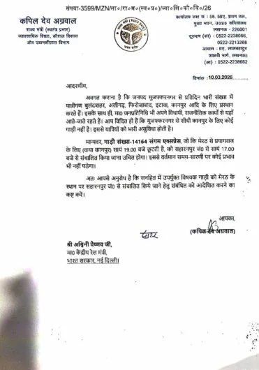 इसके अतिरिक्त मंत्री अग्रवाल ने संगम एक्सप्रेस (14164) के संचालन में संशोधन का सुझाव देते हुए कहा कि वर्तमान में यह ट्रेन मेरठ से प्रयागराज के लिए संचालित होती है। यदि इसे सहारनपुर जंक्शन से संचालित किया जाए तो सहारनपुर, मुजफ्फरनगर एवं आसपास के जनपदों के यात्रियों को कानपुर और प्रयागराज जैसे प्रमुख शहरों तक सीधी एवं सुगम रेल सुविधा प्राप्त हो सकेगी, जिससे क्षेत्र के हजारों दैनिक यात्रियों को सीधा लाभ मिलेगा।