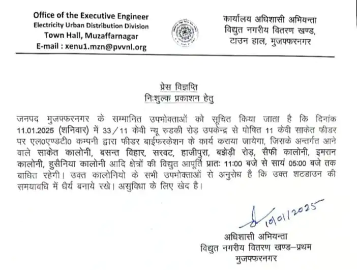 मुजफ्फरनगर- बिजली लाइन पर कार्य किये जाने के कारण कल दिनांक 11.01.2025 (शनिवार) में क़रीब 6 घंटे साकेत कॉलोनी सहित इन क्षेत्रों में बिजली बंद रहेगी।