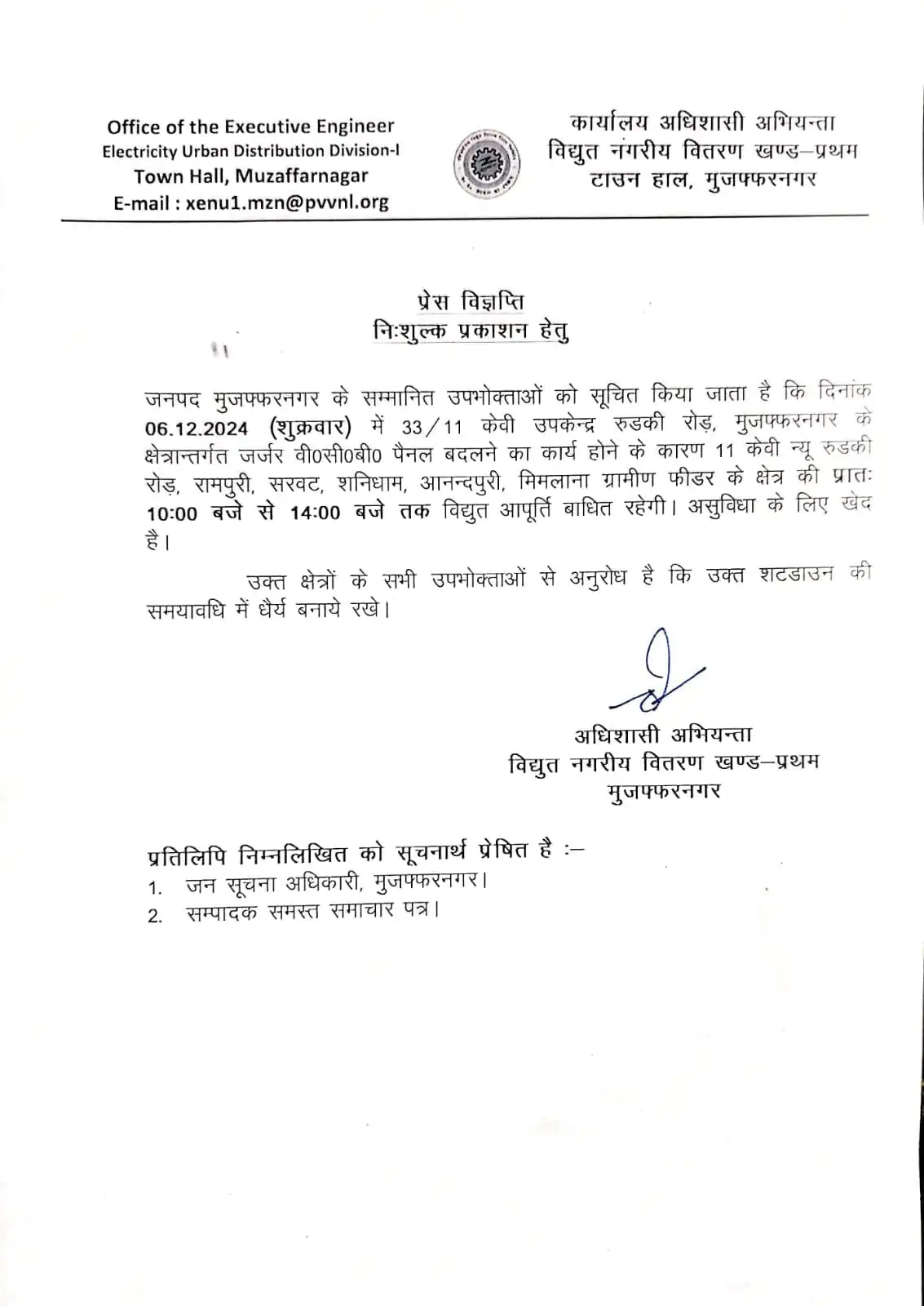 मुजफ्फरनगर के सम्मानित उपभोक्ताओं को सूचित किया जाता है कि दिनांक 06.12.2024 (शुक्रवार) में 33/11 केवी उपकेन्द्र रुडकी रोड़, मुजफ्फरनगर के क्षेत्रान्तर्गत जर्जर वी०सी०बी० पैनल बदलने का कार्य होने के कारण 11 केवी न्यू रुडकी रोड़, रामपुरी, सरवट, शनिधाम, आनन्दपुरी, मिमलाना ग्रामीण फीडर के क्षेत्र की प्रातः 10:00 बजे से 14:00 बजे तक विद्युत आपूर्ति बाधित रहेगी।