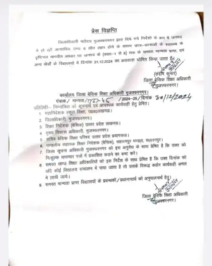 मुजफ्फरनगर- उत्तर भारत में जबरदस्त शीतलहर के मद्देनजर आज फ़िर जनपद प्रशासन ने 31 दिसम्बर को कक्षा 8 तक के स्कूलों में छुट्टी की घोषणा कर दी है। शीतकालीन अवकाश की धीरे-धीरे 1-1 दिन के अवकाश की घोषणा से बच्चों से लेकर अभिभावक व स्कूलों को भी दुविधा रहती है।