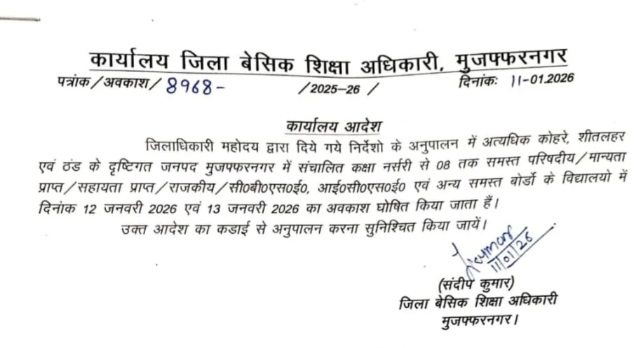 मुज़फ्फरनगर में इन दिनों शीतलहर का प्रकोप जारी है ऐसे में बच्चों व अभिभावकों को राहत देते हुए जिलाधिकारी उमेश मिश्रा के निर्देश पर जिला बेसिक शिक्षा अधिकारी ने आगामी 11 व 12 जनवरी 2026 हेतु अवकाश की घोषणा कर दी है। यह आदेश कक्षा 8 तक के छात्र-छात्राओं हेतु जारी किया गया है।