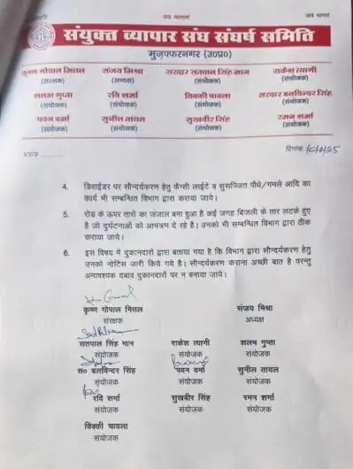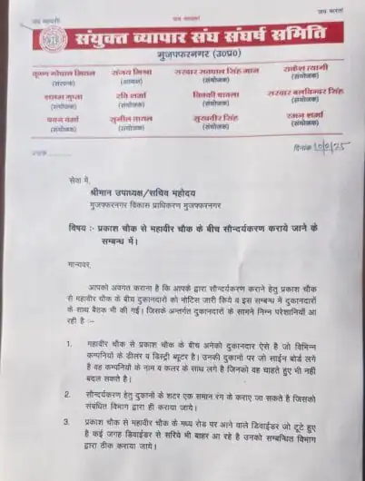 मुज़फ्फरनगर के सौंदर्यीकरण व टूटे डिवाइडरों समेत कई मुद्दों को लेकर संयुक्त व्यापार संघ ने विकास प्राधिकरण के सचिव को सौंपा ज्ञापन